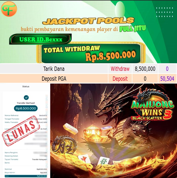 Selamat kepada User id : LA****** Telah berhasil mendapatkan kemenangan besar pada permainan TOTO MACAU 4D kemenangan Sebesar Rp. 39.000.000, Setelah mengisi formulir withdraw dengan kurung waktu hanya 5 - 10 menit pihak fulljitu sudah melakukan transfer kepada pemilik Userid dan dana sudah dapat di cairkan oleh pemenang. Bukti pembayaran yang kami berikan merupakan bukti pembayaran yang SAH / VALID yang langung di dapatkan melaui tanda transfer transaksi dari Bank yang di tuju.