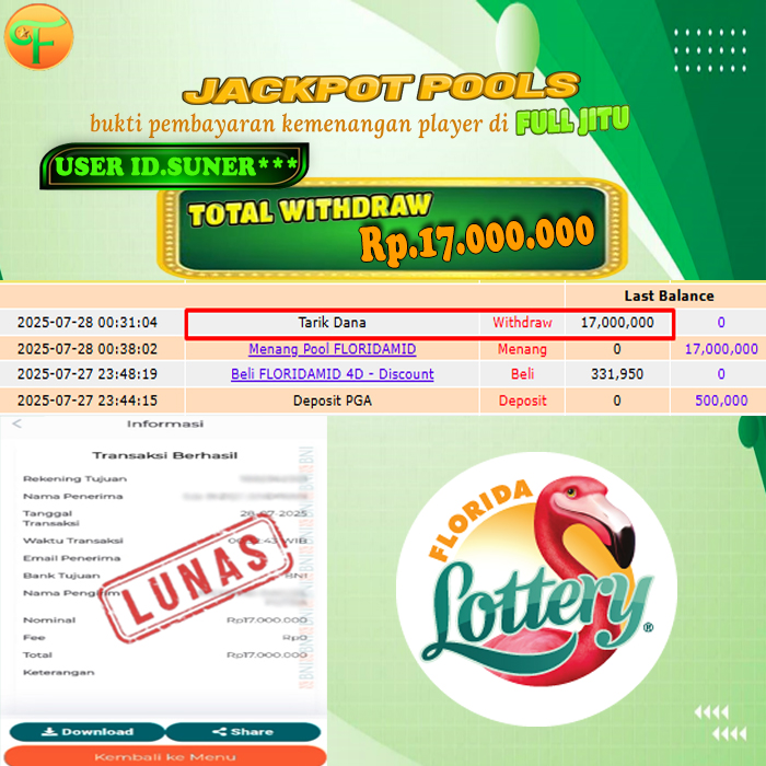 Selamat kepada User id : MA***** Telah berhasil mendapatkan kemenangan besar pada permainan THAILANDCITY BANGKOK kemenangan Sebesar Rp. 10.000.000, Setelah mengisi formulir withdraw dengan kurung waktu hanya 5 - 10 menit pihak fulljitu sudah melakukan transfer kepada pemilik Userid dan dana sudah dapat di cairkan oleh pemenang. Bukti pembayaran yang kami berikan merupakan bukti pembayaran yang SAH / VALID yang langung di dapatkan melaui tanda transfer transaksi dari Bank yang di tuju.