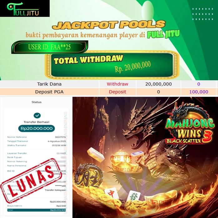 Selamat kepada User id : WA***** Telah berhasil mendapatkan kemenangan besar pada permainan LUCKY NEKO kemenangan Sebesar Rp. 8.000.000, Setelah mengisi formulir withdraw dengan kurung waktu hanya 5 - 10 menit pihak fulljitu sudah melakukan transfer kepada pemilik Userid dan dana sudah dapat di cairkan oleh pemenang. Bukti pembayaran yang kami berikan merupakan bukti pembayaran yang SAH / VALID yang langung di dapatkan melaui tanda transfer transaksi dari Bank yang di tuju.