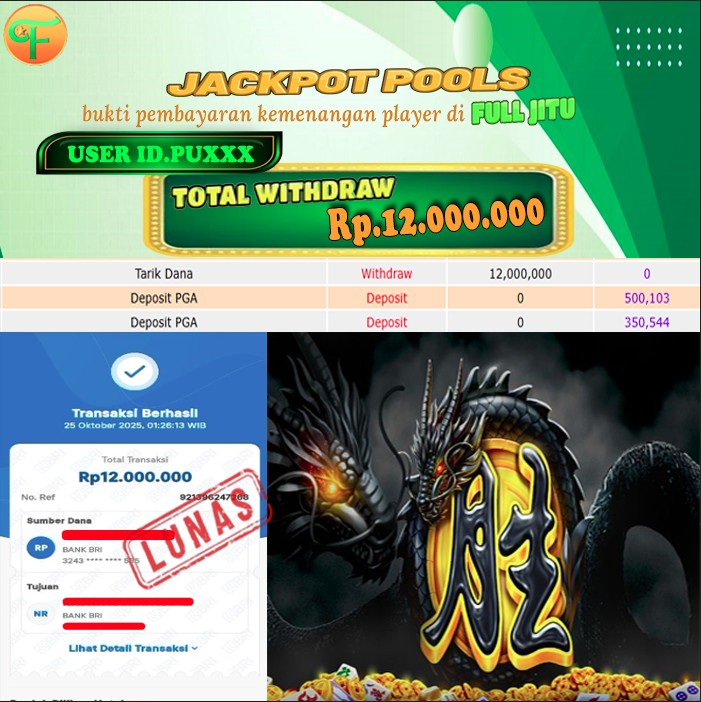 Selamat kepada User id : DE**** Telah berhasil mendapatkan kemenangan besar pada permainan GATES OF OLYMPUS SUPER SCATTER kemenangan Sebesar Rp. 100.000.000, Setelah mengisi formulir withdraw dengan kurung waktu hanya 5 - 10 menit pihak fulljitu sudah melakukan transfer kepada pemilik Userid dan dana sudah dapat di cairkan oleh pemenang. Bukti pembayaran yang kami berikan merupakan bukti pembayaran yang SAH / VALID yang langung di dapatkan melaui tanda transfer transaksi dari Bank yang di tuju.