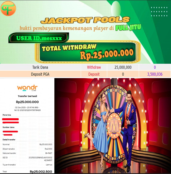 Selamat kepada User id : AT*** Telah berhasil mendapatkan kemenangan besar pada permainan HONGKONG LOTTO kemenangan Sebesar Rp. 7.100.000, Setelah mengisi formulir withdraw dengan kurung waktu hanya 5 - 10 menit pihak fulljitu sudah melakukan transfer kepada pemilik Userid dan dana sudah dapat di cairkan oleh pemenang. Bukti pembayaran yang kami berikan merupakan bukti pembayaran yang SAH / VALID yang langung di dapatkan melaui tanda transfer transaksi dari Bank yang di tuju.