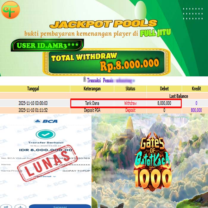 Selamat kepada User id : KA***** Telah berhasil mendapatkan kemenangan besar pada permainan TOTO MACAU kemenangan Sebesar Rp. 6.000.000, Setelah mengisi formulir withdraw dengan kurung waktu hanya 5 - 10 menit pihak fulljitu sudah melakukan transfer kepada pemilik Userid dan dana sudah dapat di cairkan oleh pemenang. Bukti pembayaran yang kami berikan merupakan bukti pembayaran yang SAH / VALID yang langung di dapatkan melaui tanda transfer transaksi dari Bank yang di tuju.