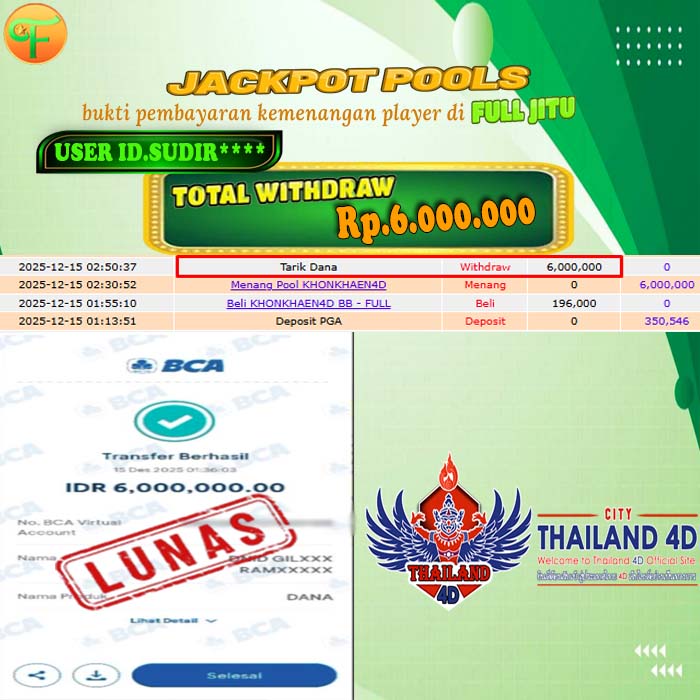 Selamat kepada User id : CU****** Telah berhasil mendapatkan kemenangan besar pada permainan HONGKONG LOTTO kemenangan Sebesar Rp. 33.333.000, Setelah mengisi formulir withdraw dengan kurung waktu hanya 5 - 10 menit pihak fulljitu sudah melakukan transfer kepada pemilik Userid dan dana sudah dapat di cairkan oleh pemenang. Bukti pembayaran yang kami berikan merupakan bukti pembayaran yang SAH / VALID yang langung di dapatkan melaui tanda transfer transaksi dari Bank yang di tuju.