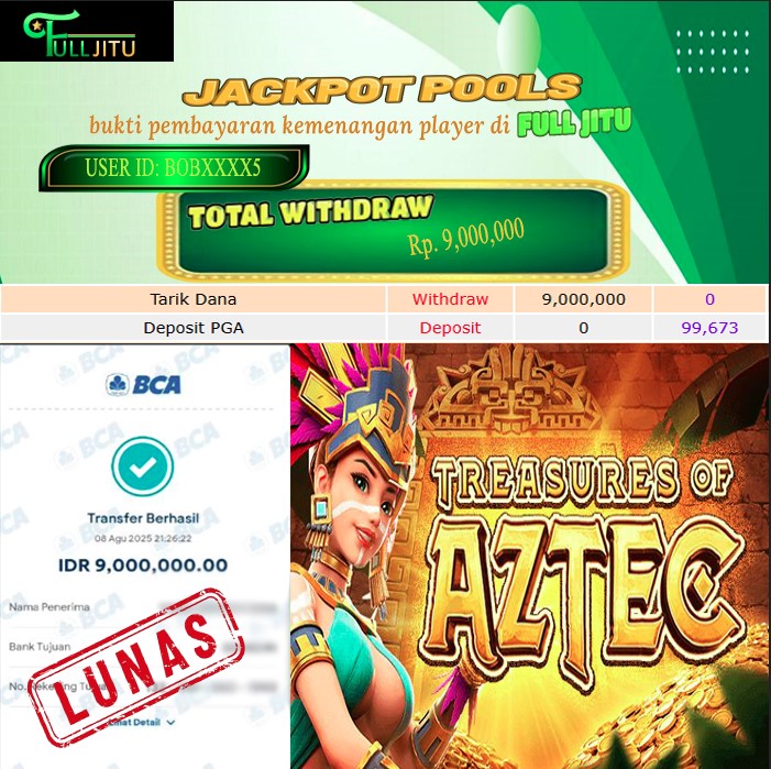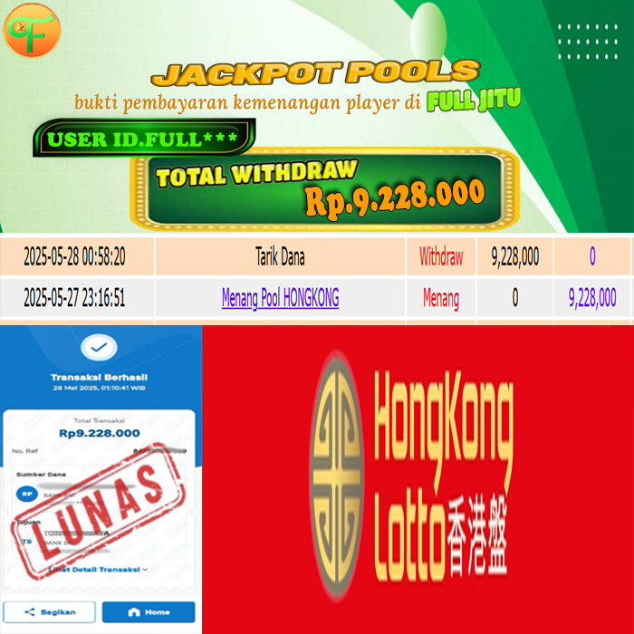 Selamat kepada User id : UJ**** Telah berhasil mendapatkan kemenangan besar pada permainan POOL SINGAPORE kemenangan Sebesar Rp. 8.000.000, Setelah mengisi formulir withdraw dengan kurung waktu hanya 5 - 10 menit pihak fulljitu sudah melakukan transfer kepada pemilik Userid dan dana sudah dapat di cairkan oleh pemenang. Bukti pembayaran yang kami berikan merupakan bukti pembayaran yang SAH / VALID yang langung di dapatkan melaui tanda transfer transaksi dari Bank yang di tuju.