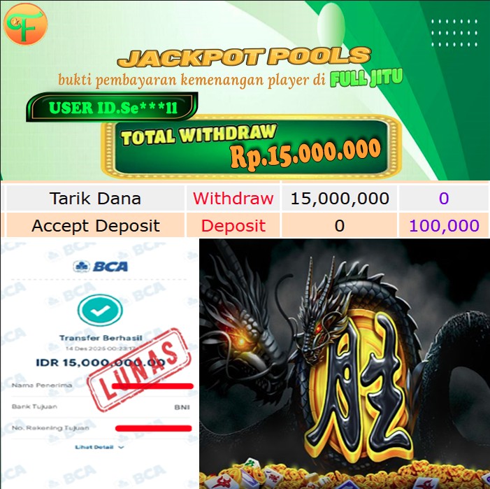 Selamat kepada User id : BU*** Telah berhasil mendapatkan kemenangan besar pada permainan BLAZING VOLCANOES kemenangan Sebesar Rp. 7.000.000, Setelah mengisi formulir withdraw dengan kurung waktu hanya 5 - 10 menit pihak fulljitu sudah melakukan transfer kepada pemilik Userid dan dana sudah dapat di cairkan oleh pemenang. Bukti pembayaran yang kami berikan merupakan bukti pembayaran yang SAH / VALID yang langung di dapatkan melaui tanda transfer transaksi dari Bank yang di tuju.