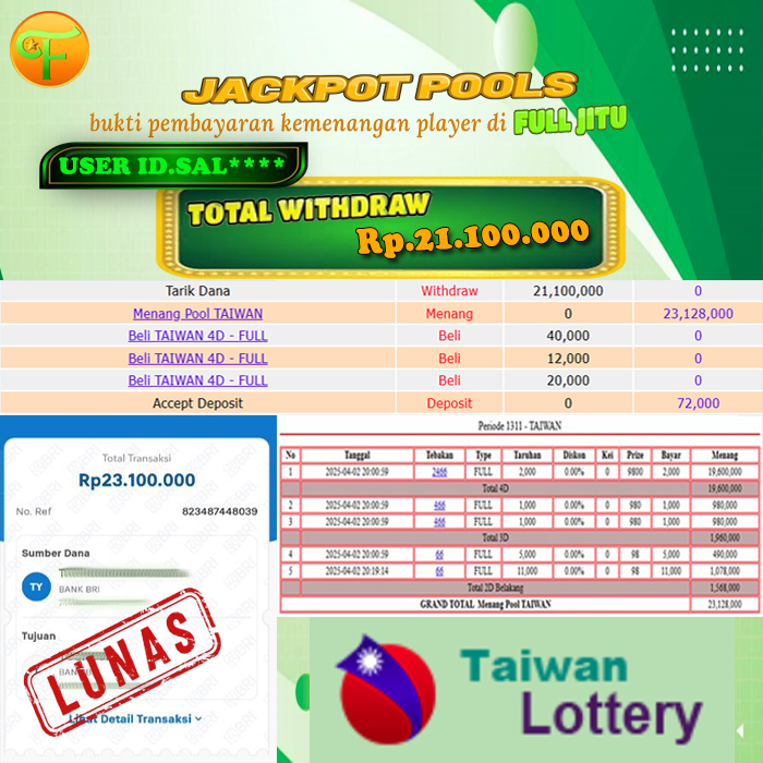 Selamat kepada User id : SA******* Telah berhasil mendapatkan kemenangan besar pada permainan BURSA POOL kemenangan Sebesar Rp. 8.000.000, Setelah mengisi formulir withdraw dengan kurung waktu hanya 5 - 10 menit pihak fulljitu sudah melakukan transfer kepada pemilik Userid dan dana sudah dapat di cairkan oleh pemenang. Bukti pembayaran yang kami berikan merupakan bukti pembayaran yang SAH / VALID yang langung di dapatkan melaui tanda transfer transaksi dari Bank yang di tuju.