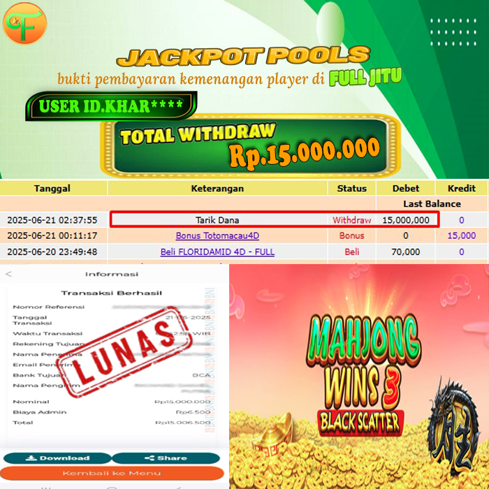 Selamat kepada User id : SU***** Telah berhasil mendapatkan kemenangan besar pada permainan FLORIDAMID 4D kemenangan Sebesar Rp. 17.000.000, Setelah mengisi formulir withdraw dengan kurung waktu hanya 5 - 10 menit pihak fulljitu sudah melakukan transfer kepada pemilik Userid dan dana sudah dapat di cairkan oleh pemenang. Bukti pembayaran yang kami berikan merupakan bukti pembayaran yang SAH / VALID yang langung di dapatkan melaui tanda transfer transaksi dari Bank yang di tuju.