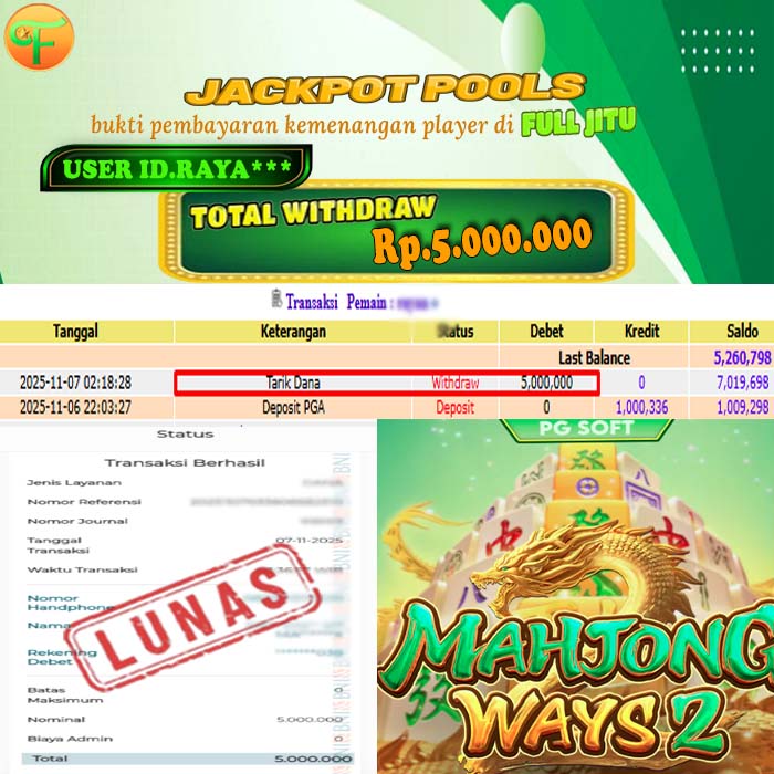Selamat kepada User id : CU****** Telah berhasil mendapatkan kemenangan besar pada permainan HONGKONG LOTTO kemenangan Sebesar Rp. 9.000.000, Setelah mengisi formulir withdraw dengan kurung waktu hanya 5 - 10 menit pihak fulljitu sudah melakukan transfer kepada pemilik Userid dan dana sudah dapat di cairkan oleh pemenang. Bukti pembayaran yang kami berikan merupakan bukti pembayaran yang SAH / VALID yang langung di dapatkan melaui tanda transfer transaksi dari Bank yang di tuju.
