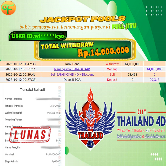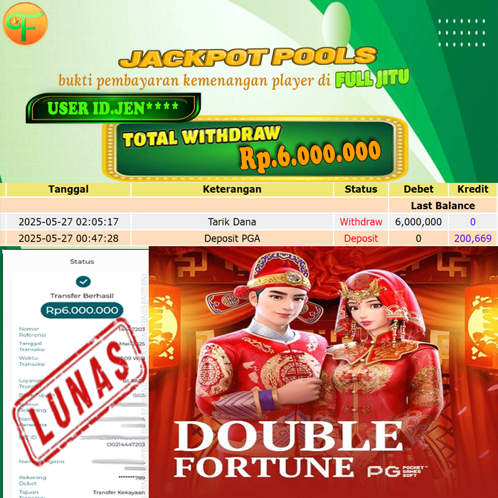Selamat kepada User id : AN***** Telah berhasil mendapatkan kemenangan besar pada permainan JECKPOT GET OLYMPUS kemenangan Sebesar Rp. 15.000.000, Setelah mengisi formulir withdraw dengan kurung waktu hanya 5 - 10 menit pihak fulljitu sudah melakukan transfer kepada pemilik Userid dan dana sudah dapat di cairkan oleh pemenang. Bukti pembayaran yang kami berikan merupakan bukti pembayaran yang SAH / VALID yang langung di dapatkan melaui tanda transfer transaksi dari Bank yang di tuju.