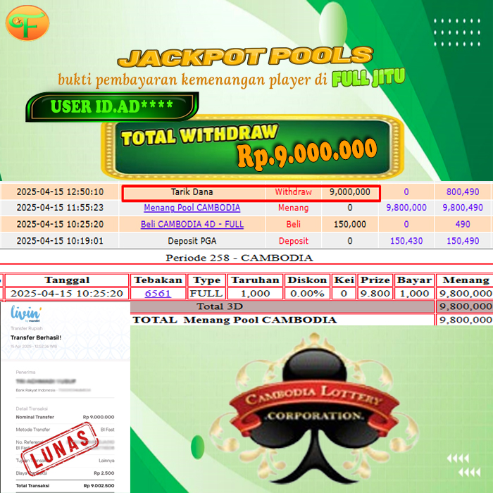 Selamat kepada User id : MU****** Telah berhasil mendapatkan kemenangan besar pada permainan SUGAR MANIA 8000 kemenangan Sebesar Rp. 10.000.000, Setelah mengisi formulir withdraw dengan kurung waktu hanya 5 - 10 menit pihak fulljitu sudah melakukan transfer kepada pemilik Userid dan dana sudah dapat di cairkan oleh pemenang. Bukti pembayaran yang kami berikan merupakan bukti pembayaran yang SAH / VALID yang langung di dapatkan melaui tanda transfer transaksi dari Bank yang di tuju.