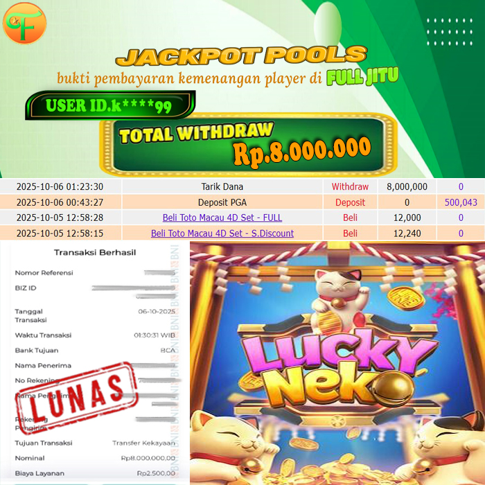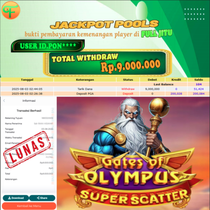 Selamat kepada User id : MI*** Telah berhasil mendapatkan kemenangan besar pada permainan GATES OF GATOT KACA 1000 kemenangan Sebesar Rp. 13.000.000, Setelah mengisi formulir withdraw dengan kurung waktu hanya 5 - 10 menit pihak fulljitu sudah melakukan transfer kepada pemilik Userid dan dana sudah dapat di cairkan oleh pemenang. Bukti pembayaran yang kami berikan merupakan bukti pembayaran yang SAH / VALID yang langung di dapatkan melaui tanda transfer transaksi dari Bank yang di tuju.