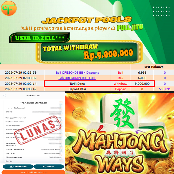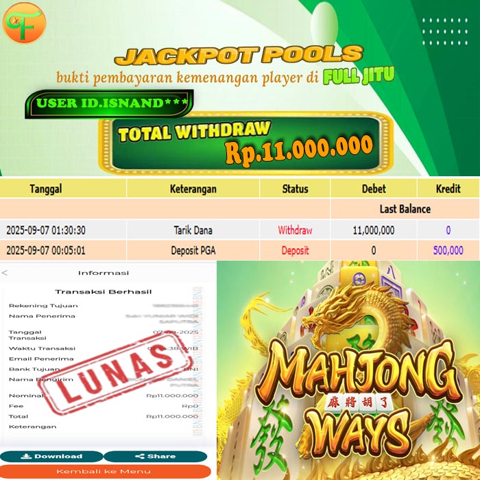 Selamat kepada User id : MA**** Telah berhasil mendapatkan kemenangan besar pada permainan SUGAR RUSH 1000 kemenangan Sebesar Rp. 10.000.000, Setelah mengisi formulir withdraw dengan kurung waktu hanya 5 - 10 menit pihak fulljitu sudah melakukan transfer kepada pemilik Userid dan dana sudah dapat di cairkan oleh pemenang. Bukti pembayaran yang kami berikan merupakan bukti pembayaran yang SAH / VALID yang langung di dapatkan melaui tanda transfer transaksi dari Bank yang di tuju.