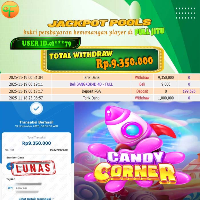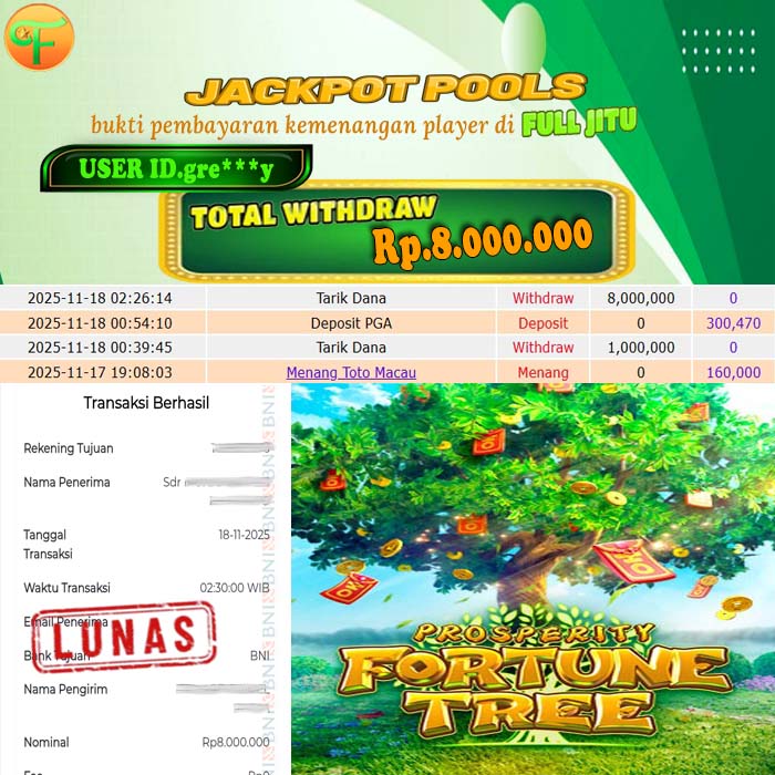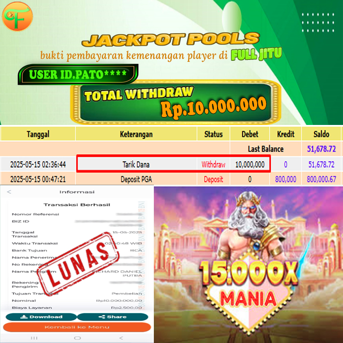 Selamat kepada User id : AN******* Telah berhasil mendapatkan kemenangan besar pada permainan ROULETTE 2 FAST GAMES kemenangan Sebesar Rp. 8.500.000, Setelah mengisi formulir withdraw dengan kurung waktu hanya 5 - 10 menit pihak fulljitu sudah melakukan transfer kepada pemilik Userid dan dana sudah dapat di cairkan oleh pemenang. Bukti pembayaran yang kami berikan merupakan bukti pembayaran yang SAH / VALID yang langung di dapatkan melaui tanda transfer transaksi dari Bank yang di tuju.