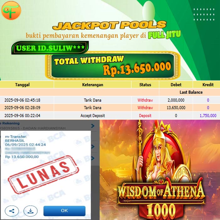 Selamat kepada User id : JO**** Telah berhasil mendapatkan kemenangan besar pada permainan STARLIGHT PRINCESS 1000 kemenangan Sebesar Rp. 15.000.000, Setelah mengisi formulir withdraw dengan kurung waktu hanya 5 - 10 menit pihak fulljitu sudah melakukan transfer kepada pemilik Userid dan dana sudah dapat di cairkan oleh pemenang. Bukti pembayaran yang kami berikan merupakan bukti pembayaran yang SAH / VALID yang langung di dapatkan melaui tanda transfer transaksi dari Bank yang di tuju.