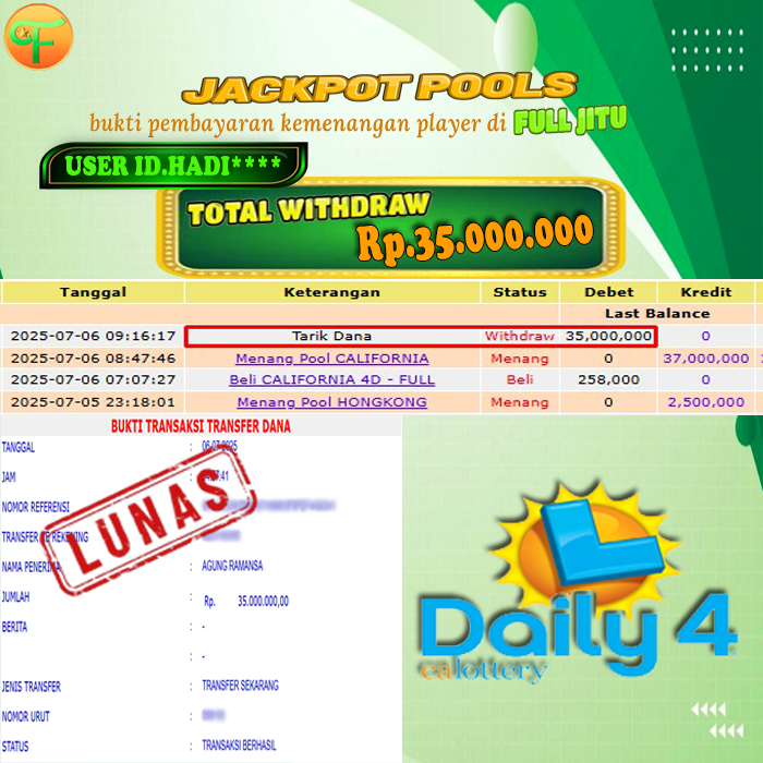 Selamat kepada User id : AM**** Telah berhasil mendapatkan kemenangan besar pada permainan FORTUNE DRAGON kemenangan Sebesar Rp. 16.900.000, Setelah mengisi formulir withdraw dengan kurung waktu hanya 5 - 10 menit pihak fulljitu sudah melakukan transfer kepada pemilik Userid dan dana sudah dapat di cairkan oleh pemenang. Bukti pembayaran yang kami berikan merupakan bukti pembayaran yang SAH / VALID yang langung di dapatkan melaui tanda transfer transaksi dari Bank yang di tuju.