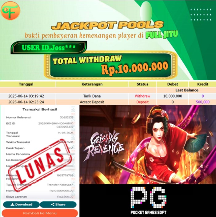 Selamat kepada User id : MS***** Telah berhasil mendapatkan kemenangan besar pada permainan AZTEC GAMS kemenangan Sebesar Rp. 9.000.000, Setelah mengisi formulir withdraw dengan kurung waktu hanya 5 - 10 menit pihak fulljitu sudah melakukan transfer kepada pemilik Userid dan dana sudah dapat di cairkan oleh pemenang. Bukti pembayaran yang kami berikan merupakan bukti pembayaran yang SAH / VALID yang langung di dapatkan melaui tanda transfer transaksi dari Bank yang di tuju.