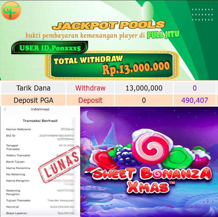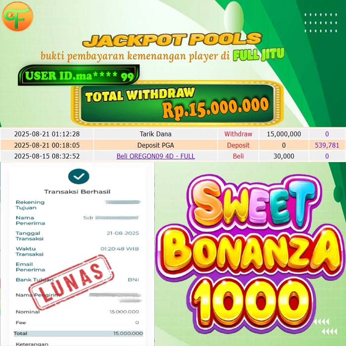 Selamat kepada User id : CI****** Telah berhasil mendapatkan kemenangan besar pada permainan CANDY CORNER kemenangan Sebesar Rp. 9.350.000, Setelah mengisi formulir withdraw dengan kurung waktu hanya 5 - 10 menit pihak fulljitu sudah melakukan transfer kepada pemilik Userid dan dana sudah dapat di cairkan oleh pemenang. Bukti pembayaran yang kami berikan merupakan bukti pembayaran yang SAH / VALID yang langung di dapatkan melaui tanda transfer transaksi dari Bank yang di tuju.