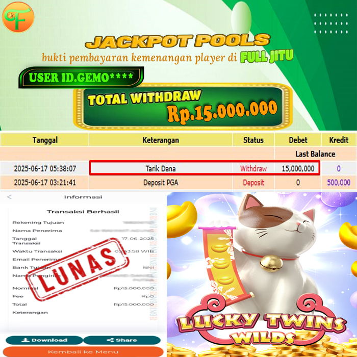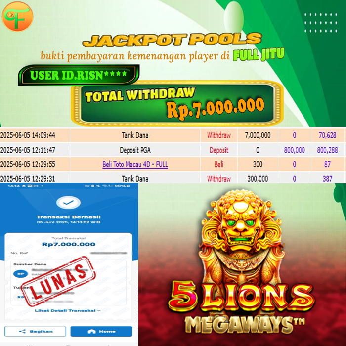 Selamat kepada User id : SA*** Telah berhasil mendapatkan kemenangan besar pada permainan STARLIGHT PRINCESS 1000 kemenangan Sebesar Rp. 25.000.000, Setelah mengisi formulir withdraw dengan kurung waktu hanya 5 - 10 menit pihak fulljitu sudah melakukan transfer kepada pemilik Userid dan dana sudah dapat di cairkan oleh pemenang. Bukti pembayaran yang kami berikan merupakan bukti pembayaran yang SAH / VALID yang langung di dapatkan melaui tanda transfer transaksi dari Bank yang di tuju.