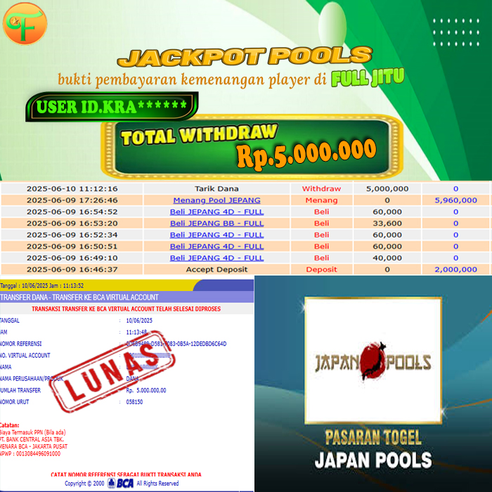 Selamat kepada User id : KA***** Telah berhasil mendapatkan kemenangan besar pada permainan TOTO MACAU kemenangan Sebesar Rp. 6.000.000, Setelah mengisi formulir withdraw dengan kurung waktu hanya 5 - 10 menit pihak fulljitu sudah melakukan transfer kepada pemilik Userid dan dana sudah dapat di cairkan oleh pemenang. Bukti pembayaran yang kami berikan merupakan bukti pembayaran yang SAH / VALID yang langung di dapatkan melaui tanda transfer transaksi dari Bank yang di tuju.