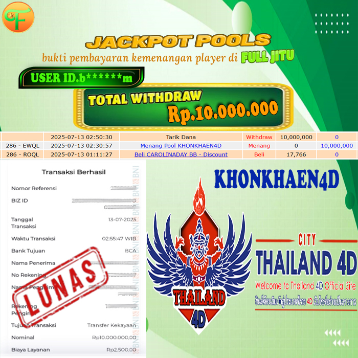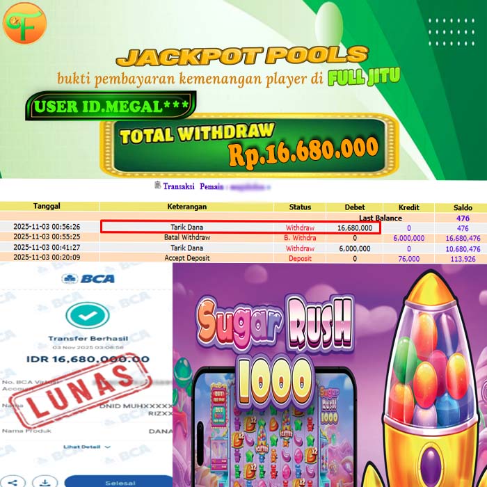 Selamat kepada User id : MA**** Telah berhasil mendapatkan kemenangan besar pada permainan FORTUNE SNAKE kemenangan Sebesar Rp. 14.000.000, Setelah mengisi formulir withdraw dengan kurung waktu hanya 5 - 10 menit pihak fulljitu sudah melakukan transfer kepada pemilik Userid dan dana sudah dapat di cairkan oleh pemenang. Bukti pembayaran yang kami berikan merupakan bukti pembayaran yang SAH / VALID yang langung di dapatkan melaui tanda transfer transaksi dari Bank yang di tuju.