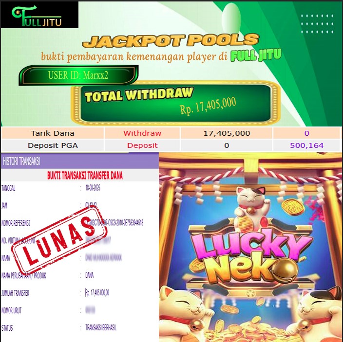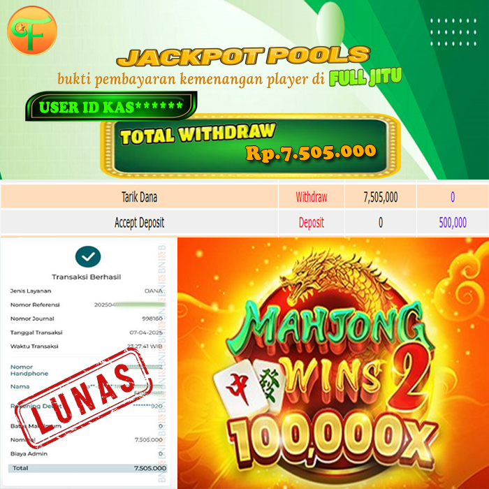 Selamat kepada User id : PA**** Telah berhasil mendapatkan kemenangan besar pada permainan 15.000X ZEUS MANIA kemenangan Sebesar Rp. 10.000.000, Setelah mengisi formulir withdraw dengan kurung waktu hanya 5 - 10 menit pihak fulljitu sudah melakukan transfer kepada pemilik Userid dan dana sudah dapat di cairkan oleh pemenang. Bukti pembayaran yang kami berikan merupakan bukti pembayaran yang SAH / VALID yang langung di dapatkan melaui tanda transfer transaksi dari Bank yang di tuju.