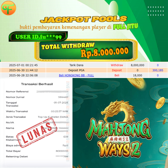 Selamat kepada User id : JO**** Telah berhasil mendapatkan kemenangan besar pada permainan CAROLINADAY kemenangan Sebesar Rp. 10.000.000, Setelah mengisi formulir withdraw dengan kurung waktu hanya 5 - 10 menit pihak fulljitu sudah melakukan transfer kepada pemilik Userid dan dana sudah dapat di cairkan oleh pemenang. Bukti pembayaran yang kami berikan merupakan bukti pembayaran yang SAH / VALID yang langung di dapatkan melaui tanda transfer transaksi dari Bank yang di tuju.