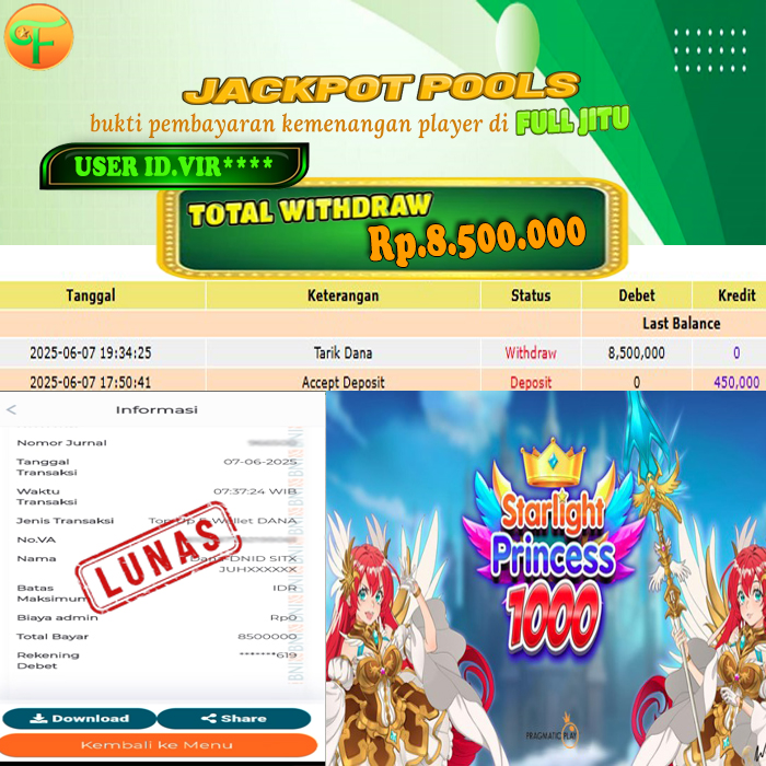 Selamat kepada User id : RI********** Telah berhasil mendapatkan kemenangan besar pada permainan 5 LIONS MEGAWAYS 2 kemenangan Sebesar Rp. 7.000.000, Setelah mengisi formulir withdraw dengan kurung waktu hanya 5 - 10 menit pihak fulljitu sudah melakukan transfer kepada pemilik Userid dan dana sudah dapat di cairkan oleh pemenang. Bukti pembayaran yang kami berikan merupakan bukti pembayaran yang SAH / VALID yang langung di dapatkan melaui tanda transfer transaksi dari Bank yang di tuju.