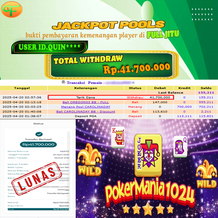 Selamat Kepada Member HTTPS://FULLJITU.COM POKER MANIA 1024 User id QU****