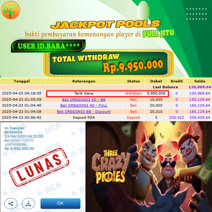 Selamat Kepada Member HTTPS://FULLJITU.COM THREE CRAZY PIGIES User id BA*********